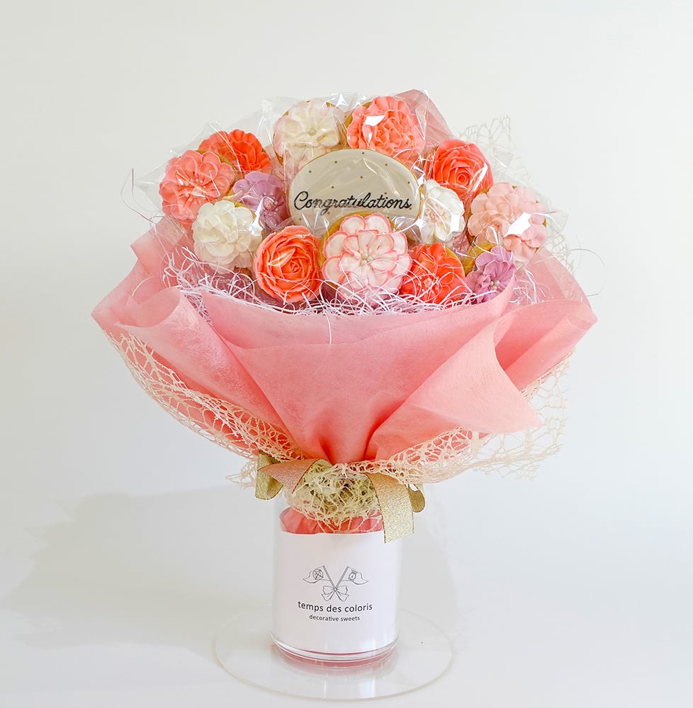 大切な人への贈りものとして、花束も素敵ですが、美味しい花束ならより喜ばれると思いませんか?タンデコロリがつくる甘すぎず、風味豊かなアイシングクッキーを花に見立てたクッキーブーケMサイズ。プレゼントにも、お祝いごとのギフトとしても、ぴったりな一品です!